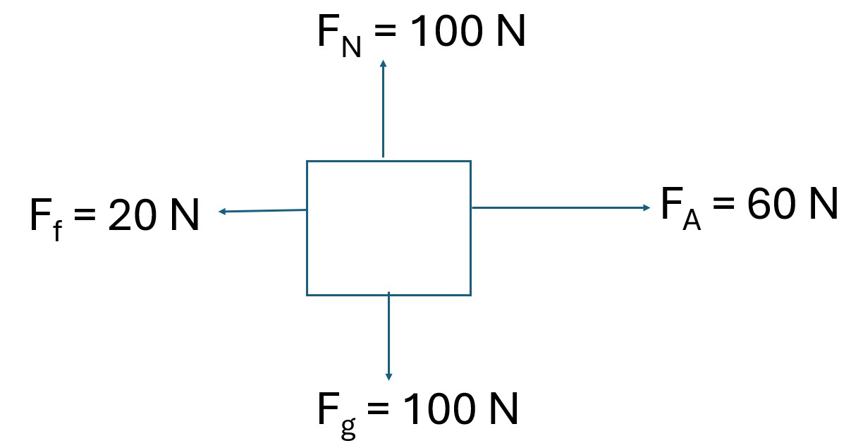 The object exerts a force of 100 N on the desk due to its weight, and the desk exerts an equal but opposite force on the object. These forces are balanced, and since there is no net force in the up and down direction, its motion will not change in those directions (it will stay on the desk). A push force is applied on the object, and the desk exerts a frictional force on the object. These forces act on the object in opposite directions, but they are of different magnitudes and hence are unbalanced. This means that the net force will act on the box in the horizontal direction, and it will move in the direction of the applied force (to the right).