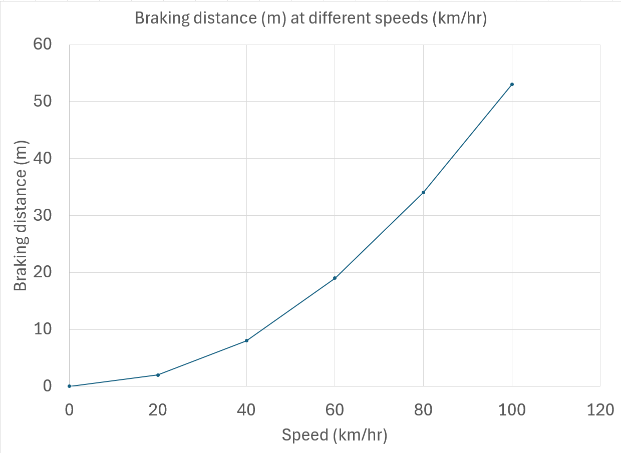 - Students are not expected to understand the mathematical reasoning for this at this stage—noticing that the braking distance is closely related to the car’s speed is sufficient.