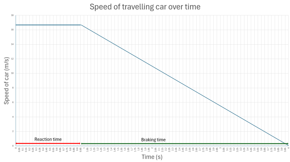 Discuss the time it takes to start braking (the reaction time) when driving a car. Recall the type of distractions that a car driver might experience and how this could impact their driving time.