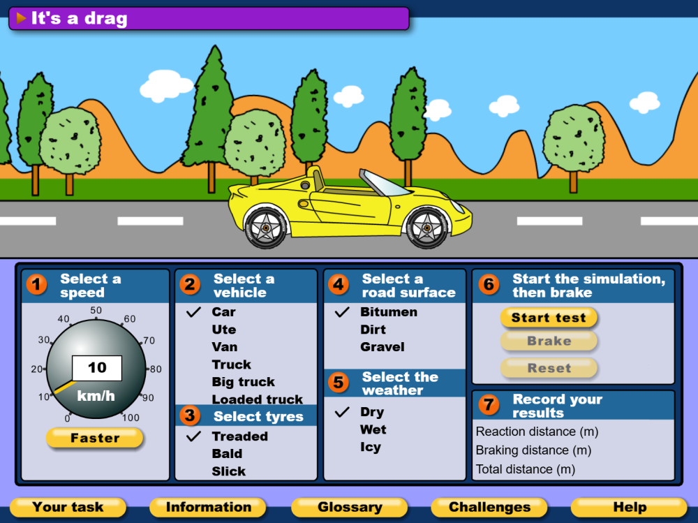 Students will need access to the It’s a drag website interactive. Provide students with a copy of the Braking distance Resource sheet.