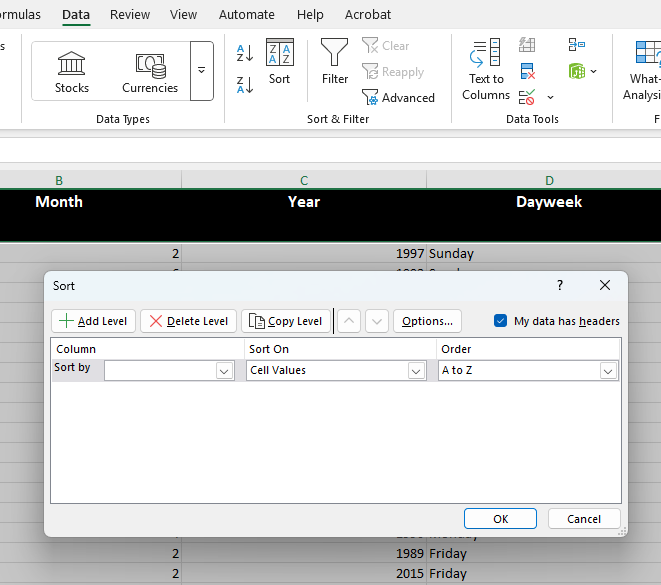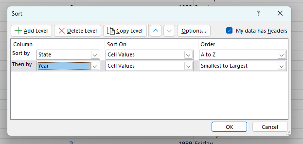 The data can now be sorted according to state. The year of the accidents can also be added to the ‘Sort’ function, by ‘Add Level’.