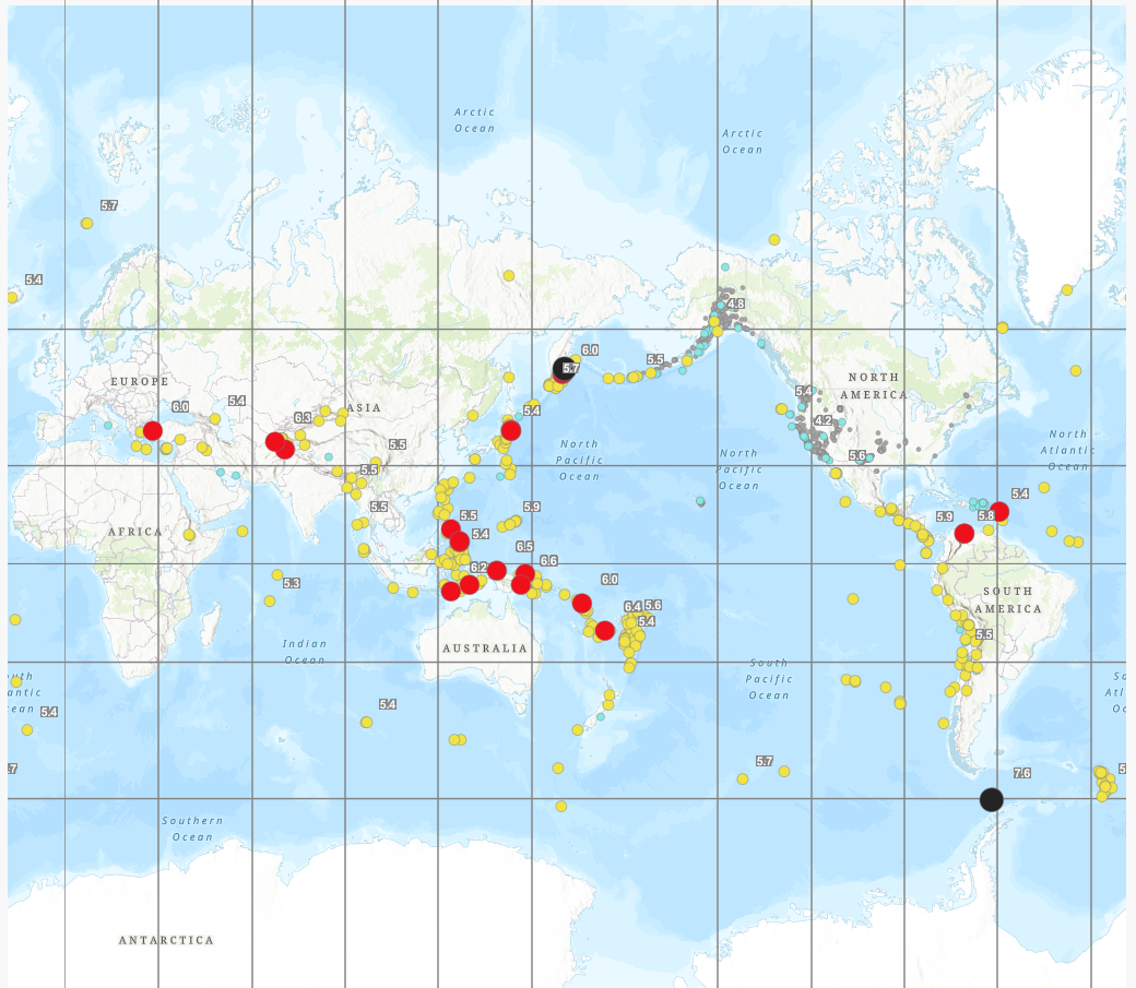 Discuss how many of the earthquakes shown on the map are located in the Ring of Fire, a horseshoe-shaped zone around the Pacific Ocean that is known for frequent earthquakes and volcanic eruptions. It contains about 75% of the world’s active volcanoes and 90% of its earthquakes.