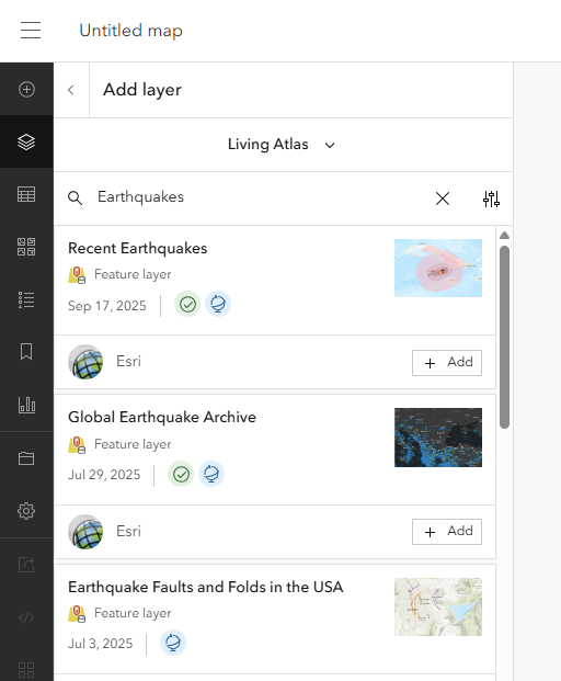 In the Layers menu in the sidepane, select ‘Add’ and then search ‘Earthquakes’. The feature layer ‘Recent Earthquakes’ should be visible in the results.